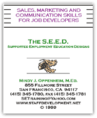 This comprehensive 147 page manual will provide the reader with tools and strategies to make great job matches for people with disabilities, and develop lasting partnerships with your customers. Topics include: Here's a nice letter I just received: My name is Joseph, I work for the Arc of Ocean County in New Jersey. I discussed with you some of the barriers I was encountering in developing our supported employment program. You shared with me some useful tactics, and suggested your booklet entitled Sales, Marketing and Communication Skills For Job Developers. I was very pleased and surprised at the amount and quality of information supplied, especially after many, many hours of researching. I must honestly say I received more from the booklet than all my other sources combined. Thank you, and I’m looking forward to being educated from your other books.